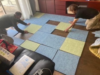 リビングは四角いマットを敷き込んで床の傷を隠します。