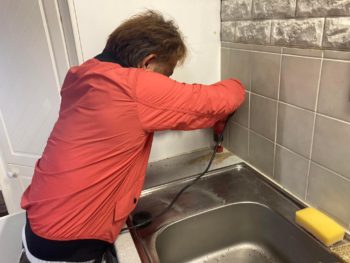 民泊オーナーが食洗機を購入してきたのでキッチンのシンク横に設置したところ上部の吊り戸棚が少し邪魔になるというので、撤去しました。