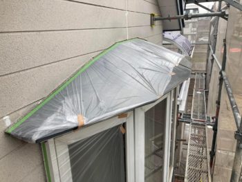 目地の古いシーリングを撤去して新しいシーリング材を充填を済ませて窓周りが塗料で汚れない様にマスカーで養生していました。