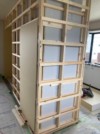 当社の工事ではなく事業者が連れてきた業者が行なっていますが、2階の広い寝室はウオークインクローゼットを取り壊して2室に区分する間仕切り工事や新たな入口ドアを設置したり工事が行われています。