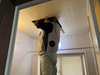 浴室の天井点検口から避難誘導灯の配線工事を行います。