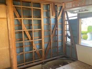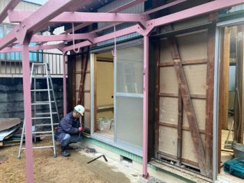 まずは外周部のトタンをめくり戸袋を外して構造材に柱頭柱脚金物を設置していきました。