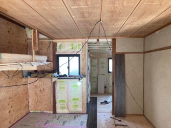 耐震補強や断熱材充填、床下地まで終わりましたので、滑りにくい床材のフロアを貼って行きます。