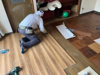 リビングの床が合板剥離で強度が下がり歩くと柔らかく撓みが出るので既存のフロアーの上に新たなフロアーを貼って強度をアップします。