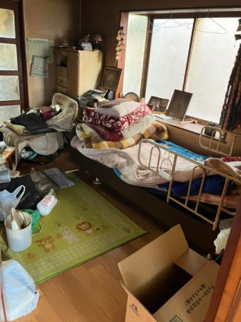 お母様の寝室では電動ベッドや生活用品が残されています。