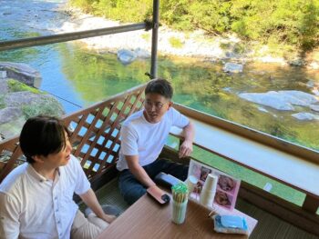 大自然に恵まれた付知川の清流で食事