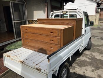桐箪笥は繊細ですが、実は「上下」に分解できるものが多く、引き出しを抜けば軽トラでの運搬もスムーズです。