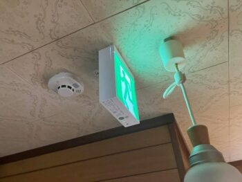 階段降り口に避難誘導灯と火災報知器を設置