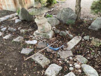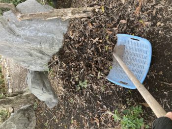 庭石や灯籠の周りに集めて置いた落ち葉をクサミで一箇所に集めました。
