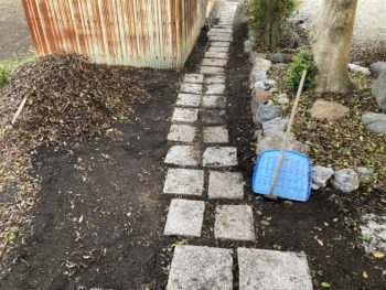 小さなジョレンで踏石の隙間に落ちた落ち葉を書き出し集めた落ち葉を山にして置いておきます。