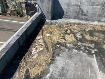 案の定、防水シートの痛みは激しく、排水ドレン周りにも土砂が溜まっておりバケツに手ですくって掃除しておきました。