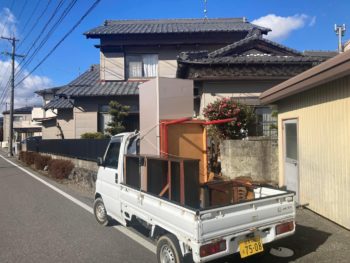 岐阜市の空き家を片付けているお客様より冷蔵庫や本棚、椅子テーブルなどをいただき、空き家より搬出して軽トラに積み各務原市へ運搬しました。