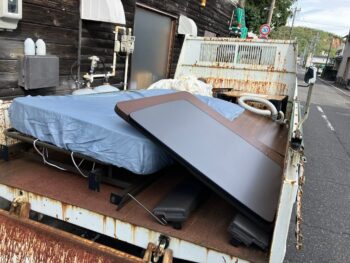まずは空き家の現地で電動ベッドを分解してダンプに積み込みしました。