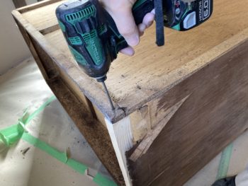 流し台の株のMDF下地が腐食し強度がなく側面合板も剥離しているので、木下地を交換して合板は木工ボンドで接着して修理しました。