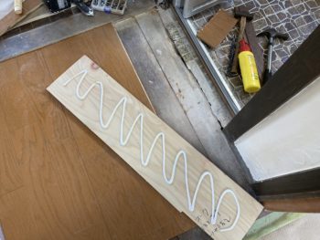 既設の床の上に合板フロアーに接着剤を塗布して釘打ちして留めていきました。