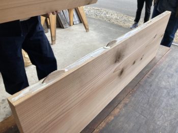 3枚の板を接着し締め付けて固まってからの足取付けですが、今回は板の接着まででした。