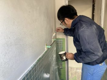マスカーで養生を行い壁や天井の周辺部は刷毛で塗装を行い中央部はローラー塗装です。