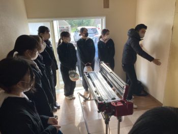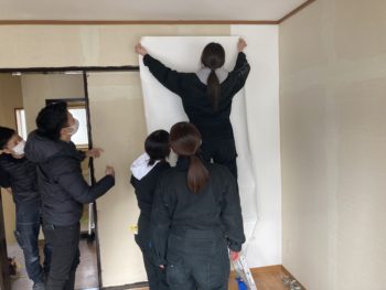 岐阜女子大学近郊の空き家で、女性シェアハウスの開設に向けて学生によるDIYクロス貼りを行いました。