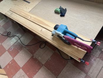 羽島市の空き家に搬入したパイン材の羽目板を昨日組み立てた作業台の上でサンディングです。