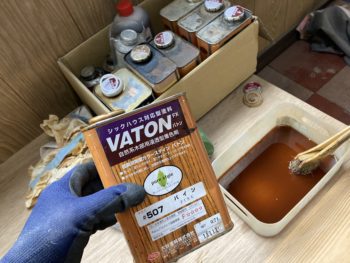 羽島市の空き家に搬入したパイン材の羽目板をサンディングして汚れを落とした後、自然塗料のバトンを塗装しました。