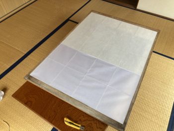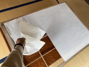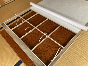 傷んだ障子紙だけを撤去して自宅で使用して余っていた破れにくい障子紙を貼りました。
