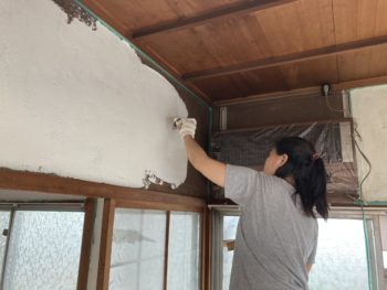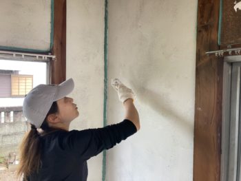 各務原市の空き家DIYリノベーション事業で入居者姉妹が和室の土壁に漆喰塗りしました。