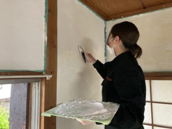 各務原市の空き家DIYリノベーション事業で提携先の岐阜女子大学の学生による漆喰塗りDIYを行いました。
