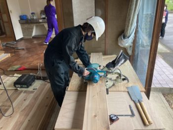 各務原市の空き家DIYリノベーション事業にて、岐阜女子大学と連携しており、和室の畳を撤去して杉板を学生さんに貼ってもらいました。