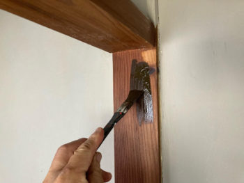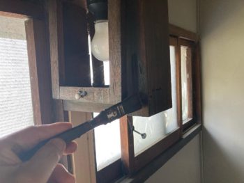 窓枠など木部の埃を落として水拭き掃除してから刷毛で木部を塗装していきます。