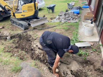 建物周りは既設配管や建物を破壊する恐れがあるので手掘りで工事を進めて排水配管や排水枡を接続して埋設しました。