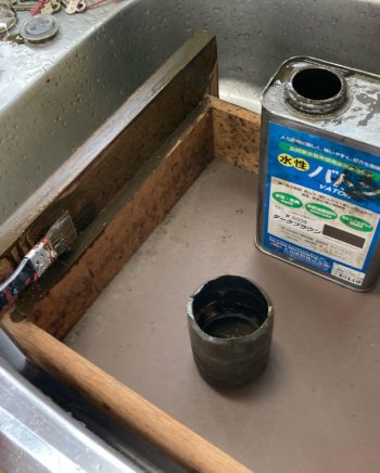 塗料はいつも使っている水性バトンのダークブラウン色ですので木部のシミや汚れも目だたなくなり重宝しています。