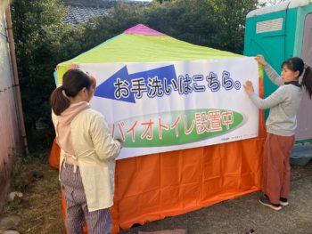 イベントには多くの親子が集まるのでトイレが不足している現状があり、先日は仮設トイレを搬入設置しましたが、さらに空き家に残されたバイオトイレをテントの中に設置されました。