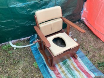 また仮設トイレには水を給水して流せる様になっていますが、汲み取りタイプなので少量の水で流せますが臭いがある事が気になりますね。
