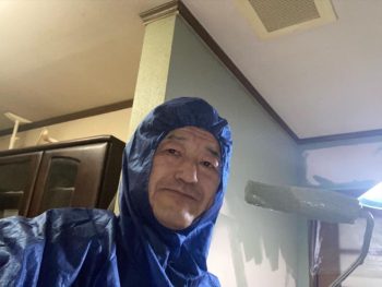ローラー塗装は回転により塗料は跳ねる事があり服が汚れるので保護服を着て作業しました。