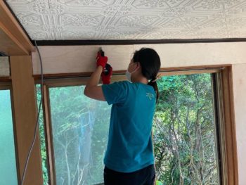高いところもタッカーでベニアを留めていきます。