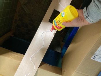 ベニアの上に巾木に接着剤を塗布し釘打ちしました。