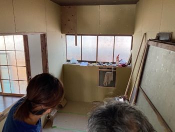 既に2室の壁や押入を解体して一部屋の洋間に改修が終わりキッチン周りを改修中でした。