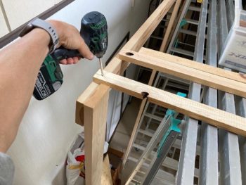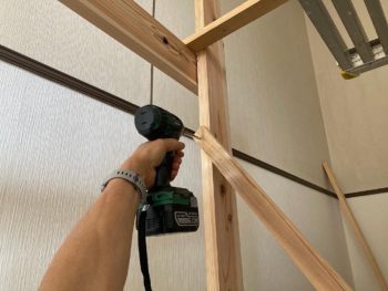 間柱を3本を柱として縦に建て、それに桁として間柱を水平にビス留めして垂直構面を作ります。