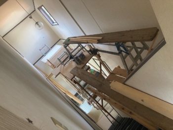 足場から階段へも道板を掛けたりしましたが階段を登る時には邪魔になるし狭い部分での足場設置は難しいですね。