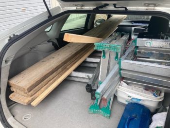 ただその床面に立っても天井に手が届きませんので、その床面に低い脚立を置き道板を掛ける事にしプリウスで運搬して搬入しました。