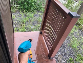 ウッドデッキに藻が付着して汚れていたので充電式の簡易な高圧洗浄機で洗浄して汚れを落としました。