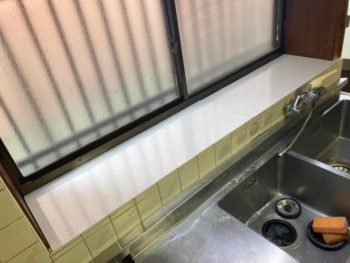 次にキッチン出窓のカウンターが汚れていて綺麗にしたいとの事で倉庫に余っていたキッチンパネルの端材をカットして敷き込みました。
