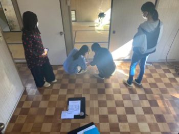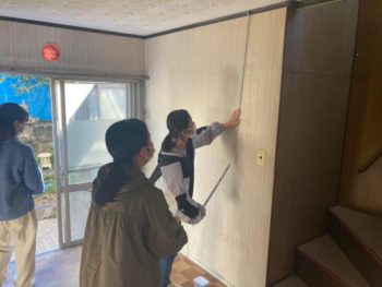 この課題に取り組む3年生の学生と先生が空き家に来て全体を見学して把握したのちチームに分かれて各部屋を採寸していきました。