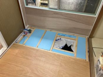もともと畳だったので、畳を撤去して根太組を行いスタイロフォーム断熱材を貼って床下地合板を貼っていきます。