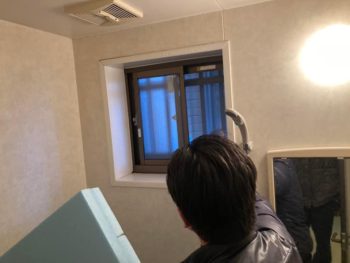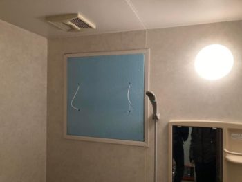 お風呂の窓が寒くて冷気が降りてくるというのでスタイロフォームを窓枠の大きさにカットして脱着しやすい様に紐を通して制作されていました。