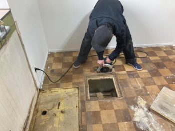 壁や床下地工事が終わってきましたので、いよいよクッションフロア貼りとなりますが、キッチンを移動させるとキッチン部の床が低かったり、床下収納庫の周りが木製枠材で出っ張っていたり床に凹凸があるので平らに修正が必要です。