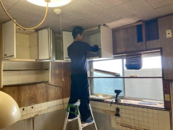 ベースキャビネットに続き換気扇や吊戸棚を撤去