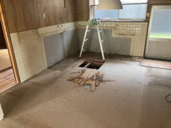 岐阜市の空き家の既設キッチンを撤去しましたが、レスキューしたキッチンをセットする前に床合板を貼ります。