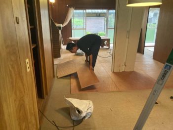 先日、楽待の取材を受けた岐阜市の空き家のLDK床を貼っています。