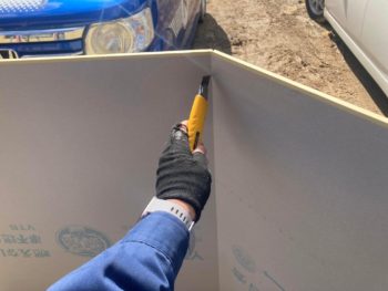 石膏ボードを寸法を測りカット